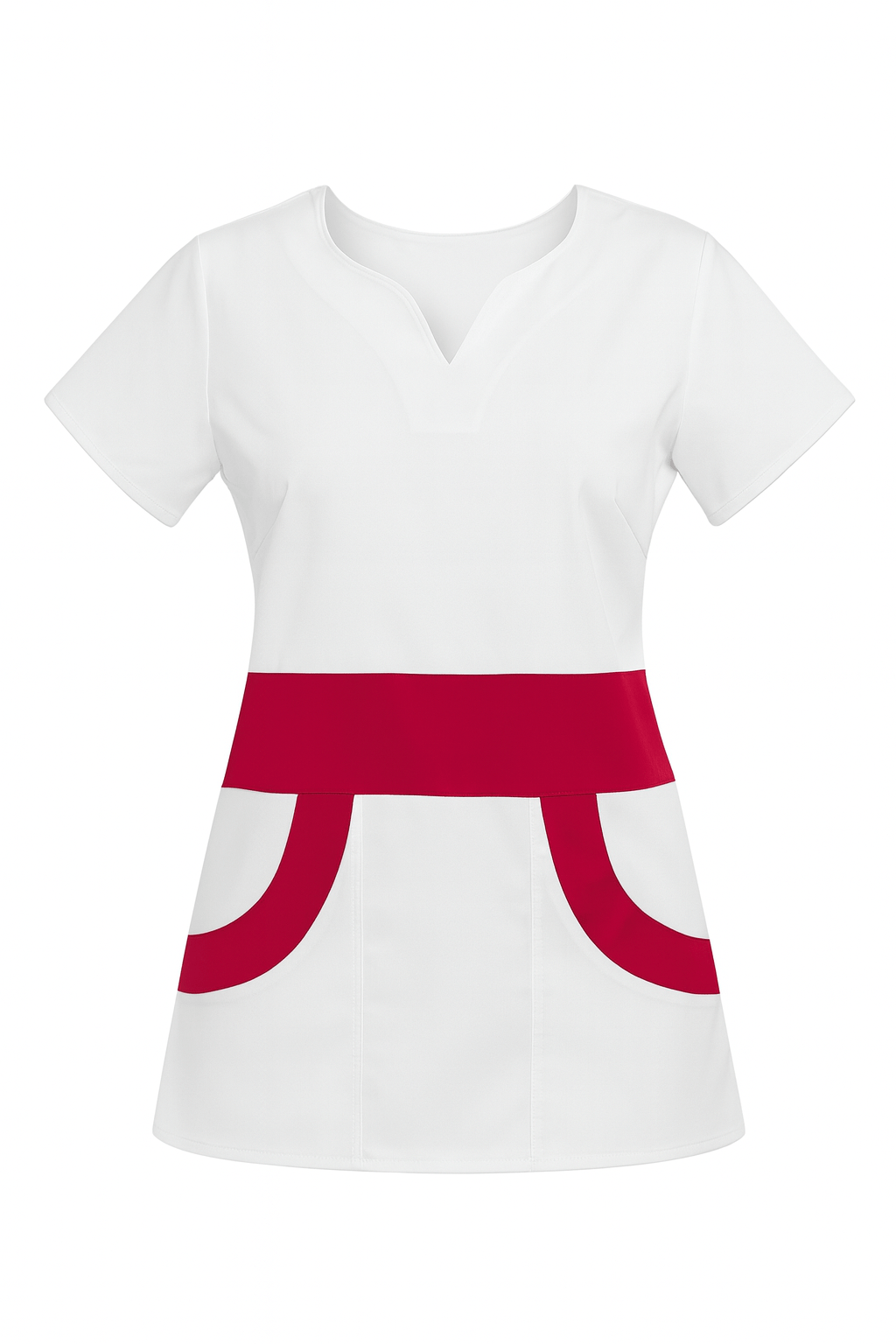 Finitions : Encolure coeur, 2 poches côtés, ceinture, longueur 68 cm
